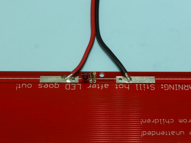 電線をハンダ付けしてください。 長さ720mmの赤黒のペア線を使ってください。 赤の線が左に来るようハンダ付けしてください。 間違えると発光ダイオードが点きません。 |