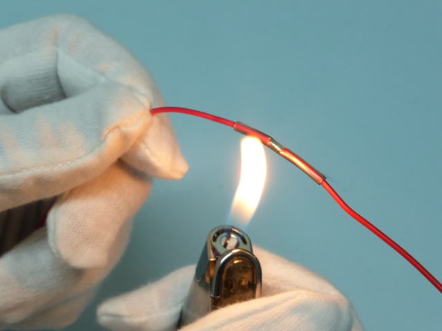 ハンダ付けした部分に熱収縮チューブを被せてライターであぶってください。 |