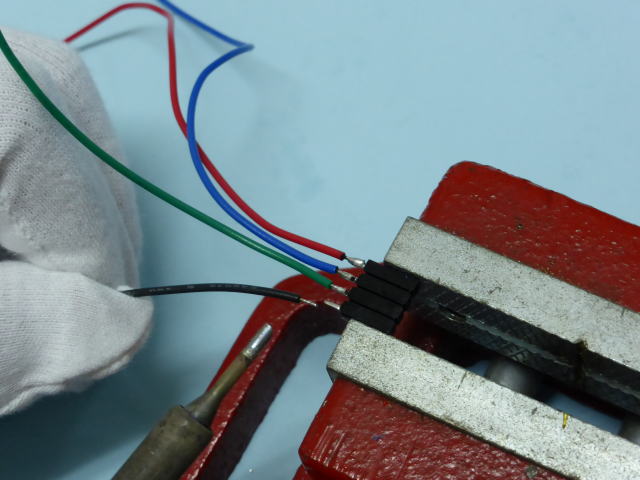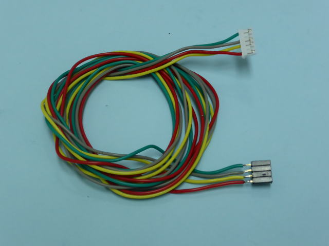 こちらはエクストルーダー付属の電線です。 白色のコネクタは既に接続されています。 もう片方は4ピンのソケットをハンダ付けしてください。 写真のように線の色が白色のコネクタと同じに順番になるようにハンダ付けしてください。 間違えると正常に動作しません。 線の色が写真と違っている場合があります。 写真の線の色 上から緑、灰、黄、赤 色が違う場合 上から緑、黒、青、赤 線の色が写真と違う場合も色が白色のコネクタと同じ順番になるようにハンダ付けしてください。 |