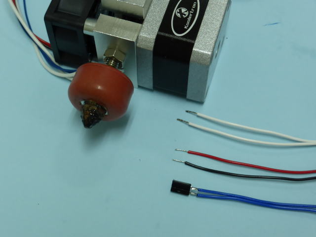 9 プリントヘッド用ケーブルの処理 プリントヘッドの線は延長してください。 白色 ヒーター用です。 長さ520mmの白色の延長用電線を使ってください。 末端はハンダを染み込ませてください。 赤黒 ファンモーター用です。 長さ1000mmの赤と黒の延長用電線を使ってください。 末端はハンダを染み込ませてください。 青色 サーミスター用です。 長さ650mmの青色の延長用電線を使ってください。 末端には2ピンのソケットをハンダ付けしてください。 |