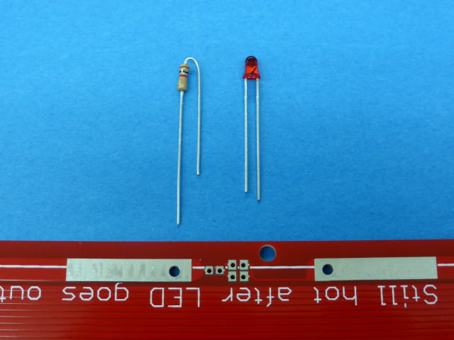 7-1 ヒートベッドの配線(発光ダイオードが丸型の場合) ヒートベッドに発光ダイオードと抵抗を取り付けます。 発光ダイオードの形状が丸型の場合と角型の場合の2種類があります。 先に丸型の場合を示します。 角型の場合は7-3へ飛んでください。 出荷時期によって発光ダイオードと抵抗(いずれも面実装型)が既に実装されている場合があります。その場合は「7-2 電線のはんだ付け」へ飛んでください。 |