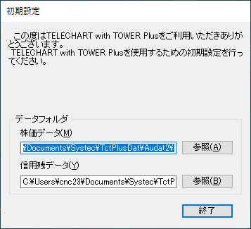 終了したらTELECHART with TOWER Plusを一旦終了し、再度TELECHART with TOWER Plusを起動してください。
